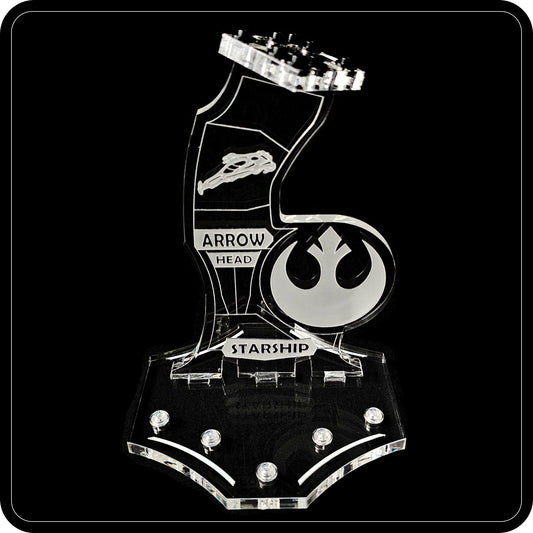 "A stand for the V-19 Torrent Starfighter model, featuring an angular, geometric design. An engraved Republic emblem dominates the central area, while etched lines on the surface accentuate the stand's form and the model's dynamic, inclined display angle."